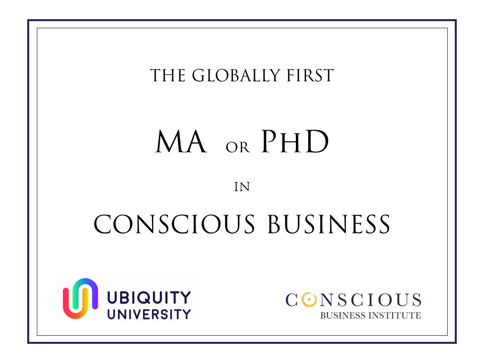 If you choose, you can upgrade your program participation to a graduate MA or PhD degree in Conscious Business with Ubiquity University, the global university for social impact.